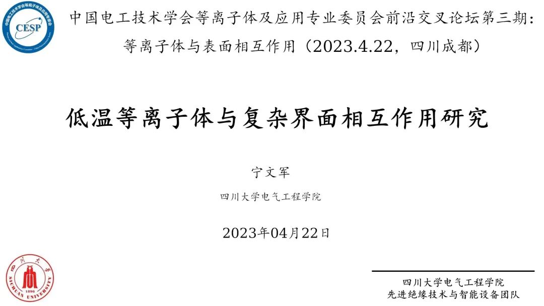 在2023年中国电工技术学会等离子体及应用专业委员会前沿交叉论坛第三期:等离子体与表面相互作用论坛上,学院副研究员宁文军作了题为“低温等离子体与复杂界面相互作用研究”的报告,经本人授权,与大家分享。