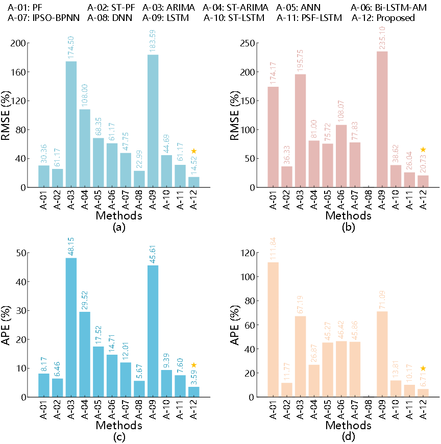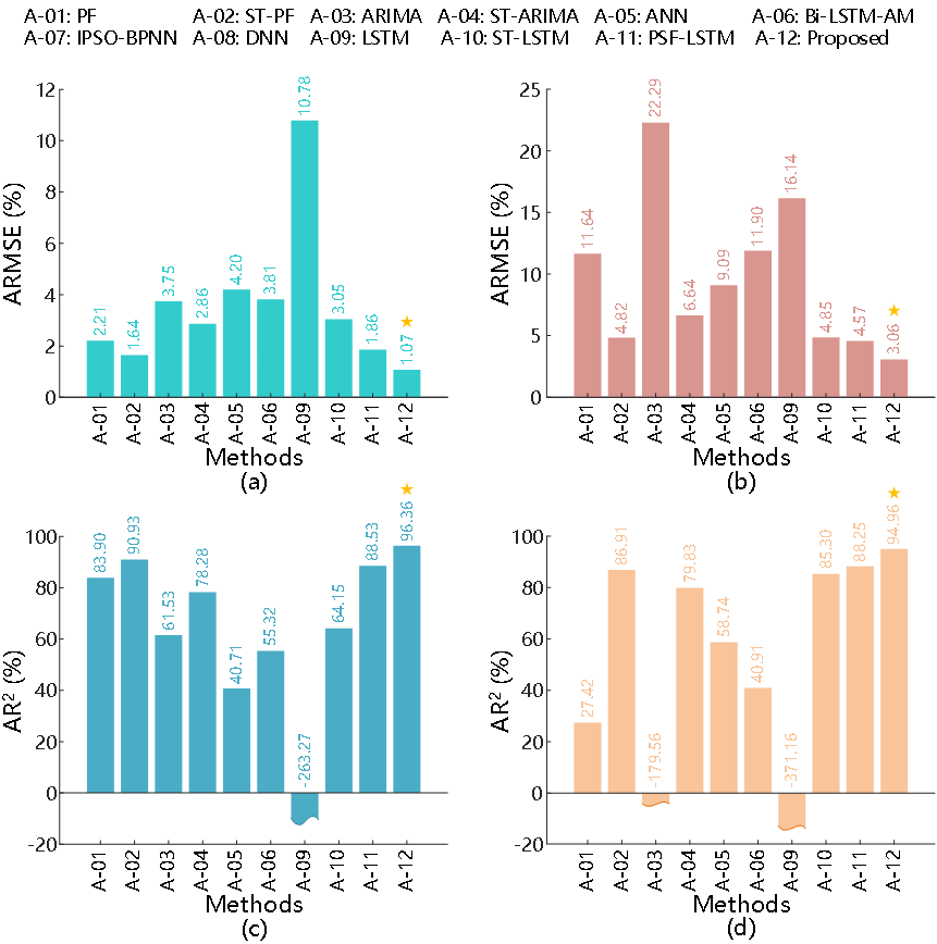 锂离子电池广泛应用于电动汽车、工业等领域。 他们在早期周期阶段的RUL预测对于提高可靠性具有重要意义。然而,在工程实践中,早期周期阶段的RUL预测存在一些挑战问题,包括迭代预测中的累积误差、样本尺寸不一致以及Reimann采样框架下的低效率。因此,本文提出了一种锂离子电池RUL预测方法,命名为LS-PSF-LSTM。分别使用MIT数据集和Tongji数据集进行了早期预测起始点为100次循环时的容量退化轨迹和RUL预测实验。LS-PSF-LSTM方法使用MIT数据集进行容量退化轨迹预测时,ARMSE为1.07%,AR2为96.4%。对于RUL预测,该方法实现了14.52的RMSE和3.59%的APE,平均预测时间为8.75秒。同时,使用Tongji数据集,所提出的方法实现了容量退化轨迹预测的ARMSE为3.06%和AR2为95.0%,RUL预测的RMSE为20.73和APE为6.71%,平均预测时间为4.69秒。