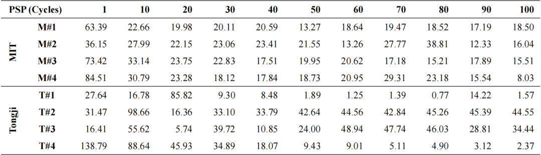 除了PSP等于100个周期时的RUL预测外,所提出的方法在1到100个周期的不同PSP下执行100次,RMSE指标的评估结果如表所示。当PSP设置为1时,由于参考数据不足,所选相似样本的质量受到限制,这严重阻碍了相似样本的有效性,导致与其他PSP情况相比,RUL预测不准确。随着PSP的增加,相似样本的质量提高,RMSE计算结果相应降低。当PSP设置为100个循环时,MIT数据集中测试样本的RMSE计算结果小于18.50,最小为8.03。在同济数据集中,当PSP为100次循环时,RMSE计算结果最小值达到1.57,循环寿命为712的T#4测试样本的RMSE计算结果达到2.37。