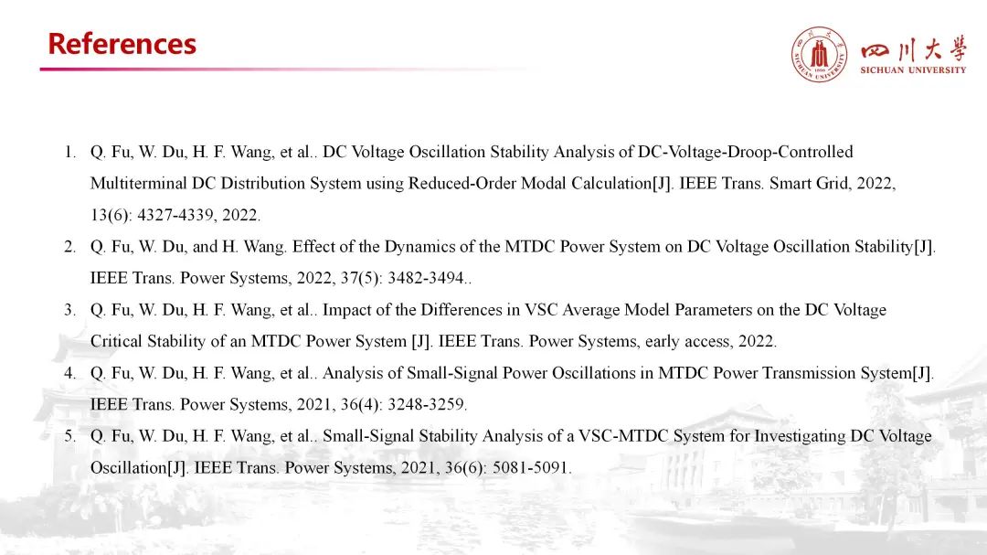 付强,四川大学永利集团3044am电能质量与优质供电团队副研究员,四川省青年创新团队、四川大学新能源电力系统工科特色团队成员,博士毕业于华北电力大学,研究方向为新能源、储能与柔性直流输电系统的稳定性分析与控制。累计发表论文40篇,其中IEEE PES Trans论文18篇;担任IEEE Trans期刊、《电力系统自动化》审稿人。近期研究重点是多端柔性直流输电系统的宽频振荡及抑制,并已依托国内实际工程完成复现,期待与各位专家学者一起交流合作。