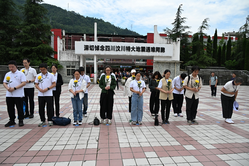 在汶川特大地震纪念馆,断裂的时钟永远定格在14时28分。讲解员王爱新作为地震亲历者,眼含热泪回忆起抗震救灾的感人瞬间:“地动山摇的瞬间,映秀镇学校的老师们迅速组织疏散,用血肉之躯护住学生;随后,党员突击队冒着余震风险争分夺秒抢救被困群众,在废墟中筑起生命通道。”全体师生党员在漩口中学遗址前肃立默哀,向地震遇难者敬献鲜花,致以最深切的缅怀和敬意。
