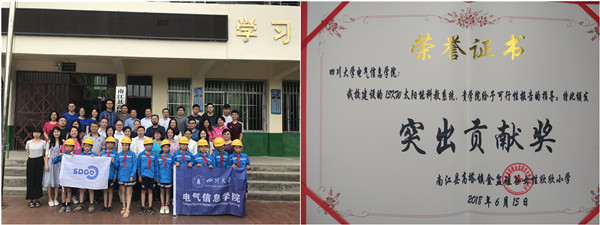 启动仪式上,金盆小学校长张斌表达了他对四川大学及社会各界的深深感谢,中国社会工作联合会企业公民委员会专职副会长刘卫华先生也对四川大学和企业的爱心之举给予了高度评价:“15千瓦太阳能光伏系统项目的落成具有重要意义,彰显了高校和企业的社会责任,是对‘智慧乡村’理念的践行与创新,是高校、企业、政府及社会各界合作的优秀典范,将对能源科教脱贫具有及其重要的示范作用和很好的推广价值”。四川大学电气信息学院获得金盆小学颁发的“突出贡献奖”。