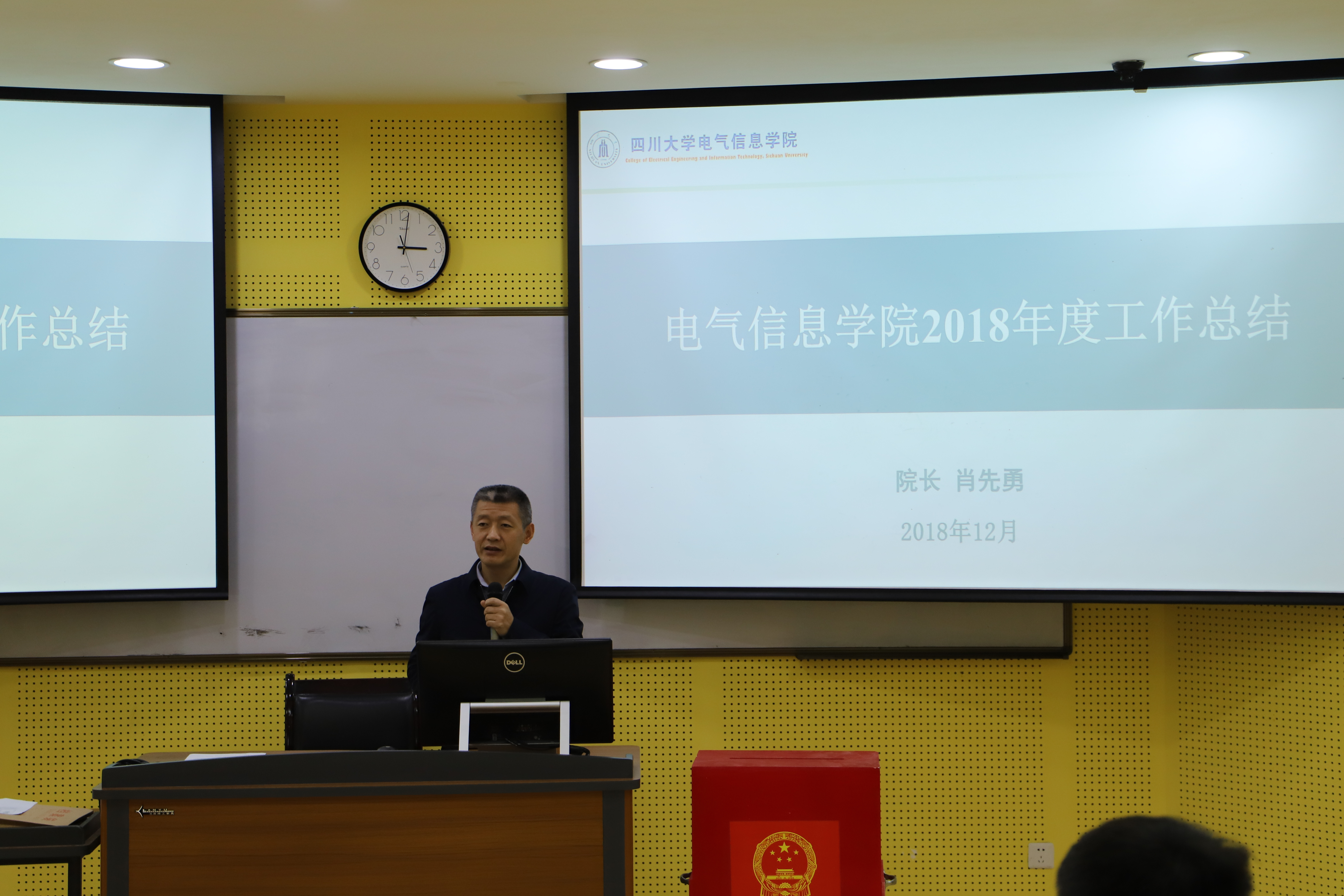 接下来,院长肖先勇对照2018年度的目标任务进行了工作总结和岗位述职。肖先勇院长分别从师资队伍、人才培养、科研学科、国际合作、实验室建设、招生就业六个方面,总结了学院取得的成绩,感谢全院老师的全力拼搏。