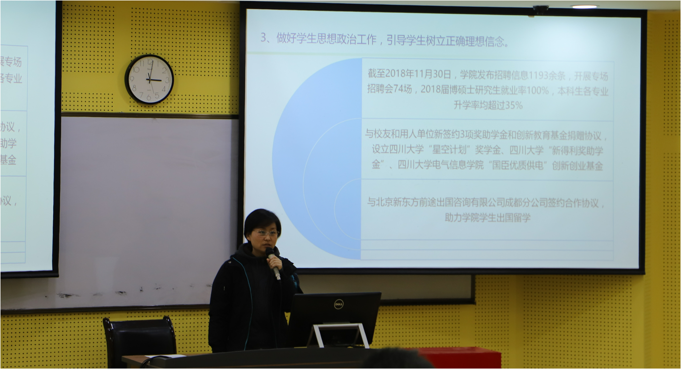 12月14日下午,电气信息学院领导班子和领导人员年度述职和岗位测评会在望江校区研究生楼一区104(水上报告厅)举行。学院领导班子成员、全体在职教职工和部分离退休代表参加了会议。会议由学院党委副书记戴婷婷主持。