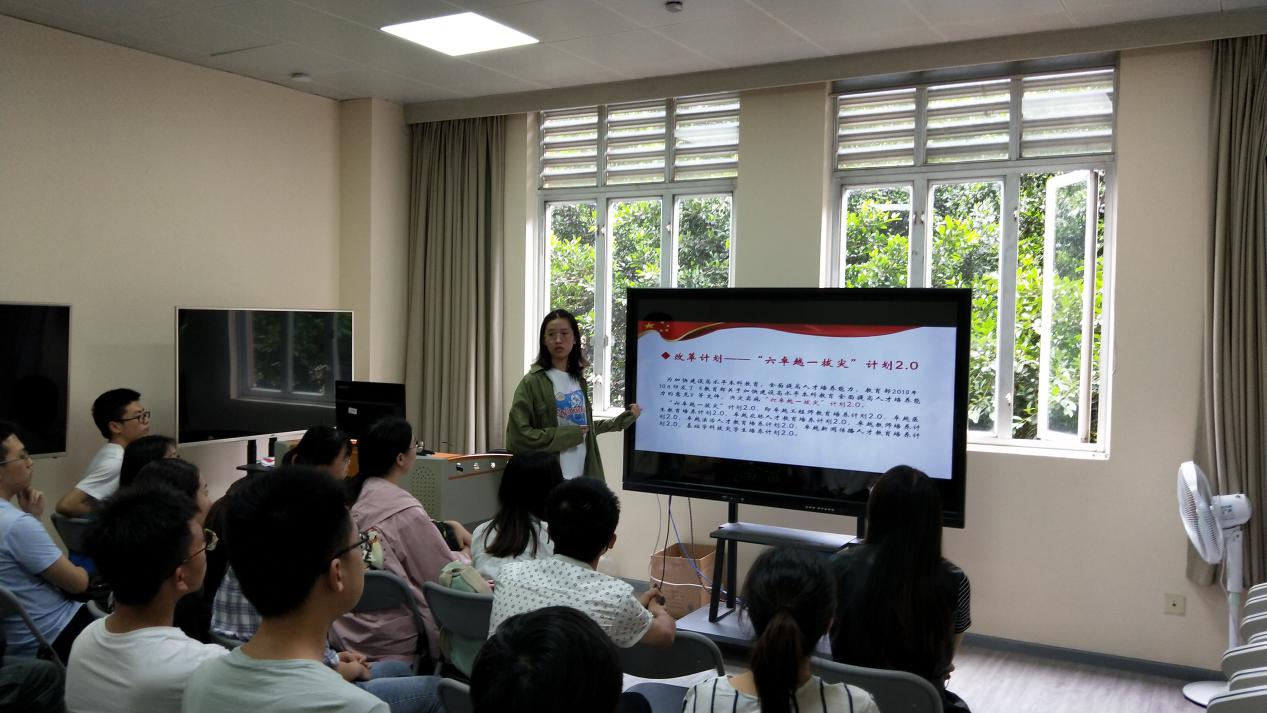 支委会成员代表蒋兴玺,方梦秋同学分享小组讨论结果。蒋兴玺同学以本科教育的发展、本科教育改革的必要性、本科教育改革计划与最终方向带来展示。她表示“本科教育改革应当有四个回归,即‘回归常识、回归本分、回归初心、回归梦想’。”方梦秋同学则以五个“如何”引出主题,表示本科教育改革与发展应当“促进探究式学习”、“重视双创教育”“实现跨学科人才培养”等。