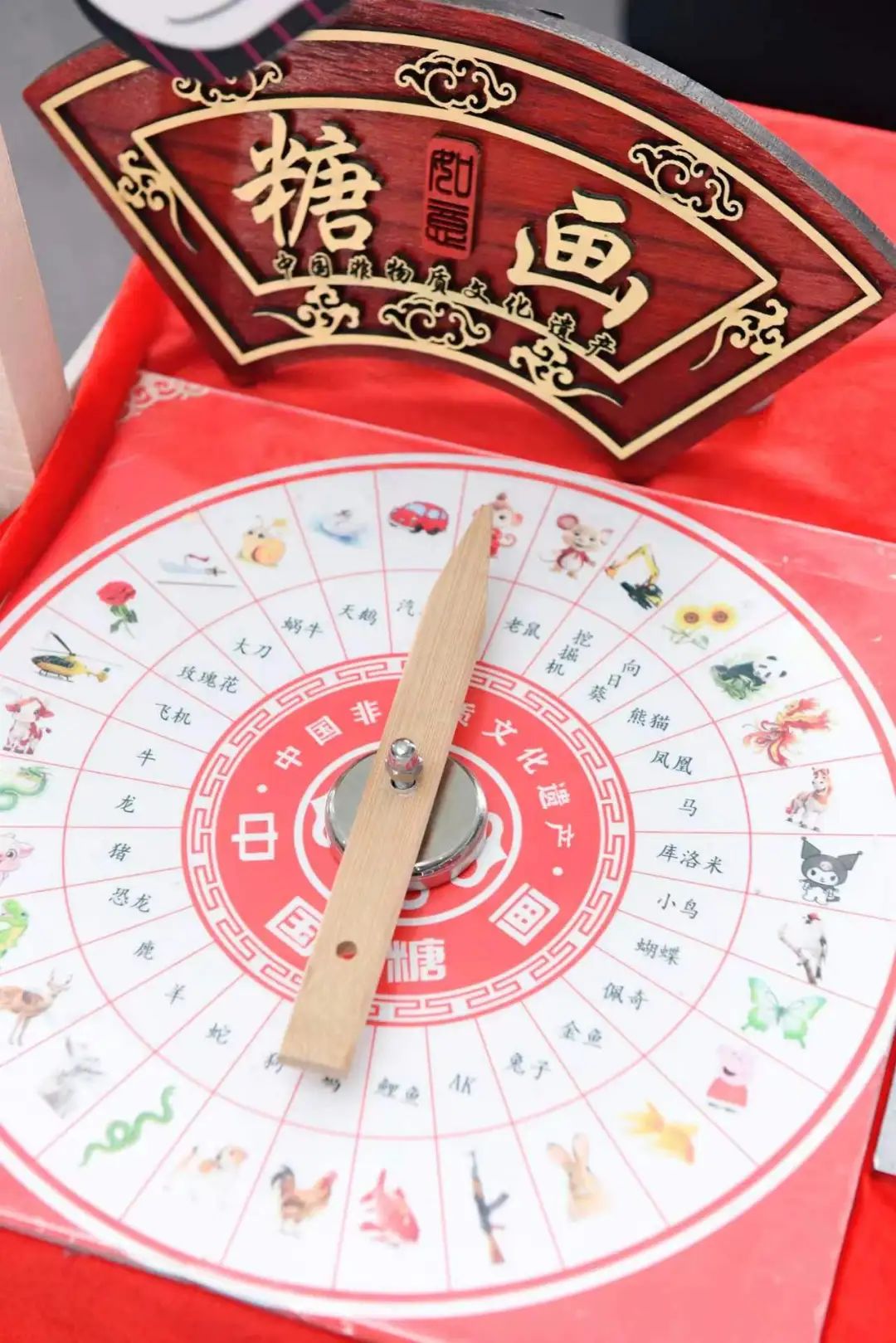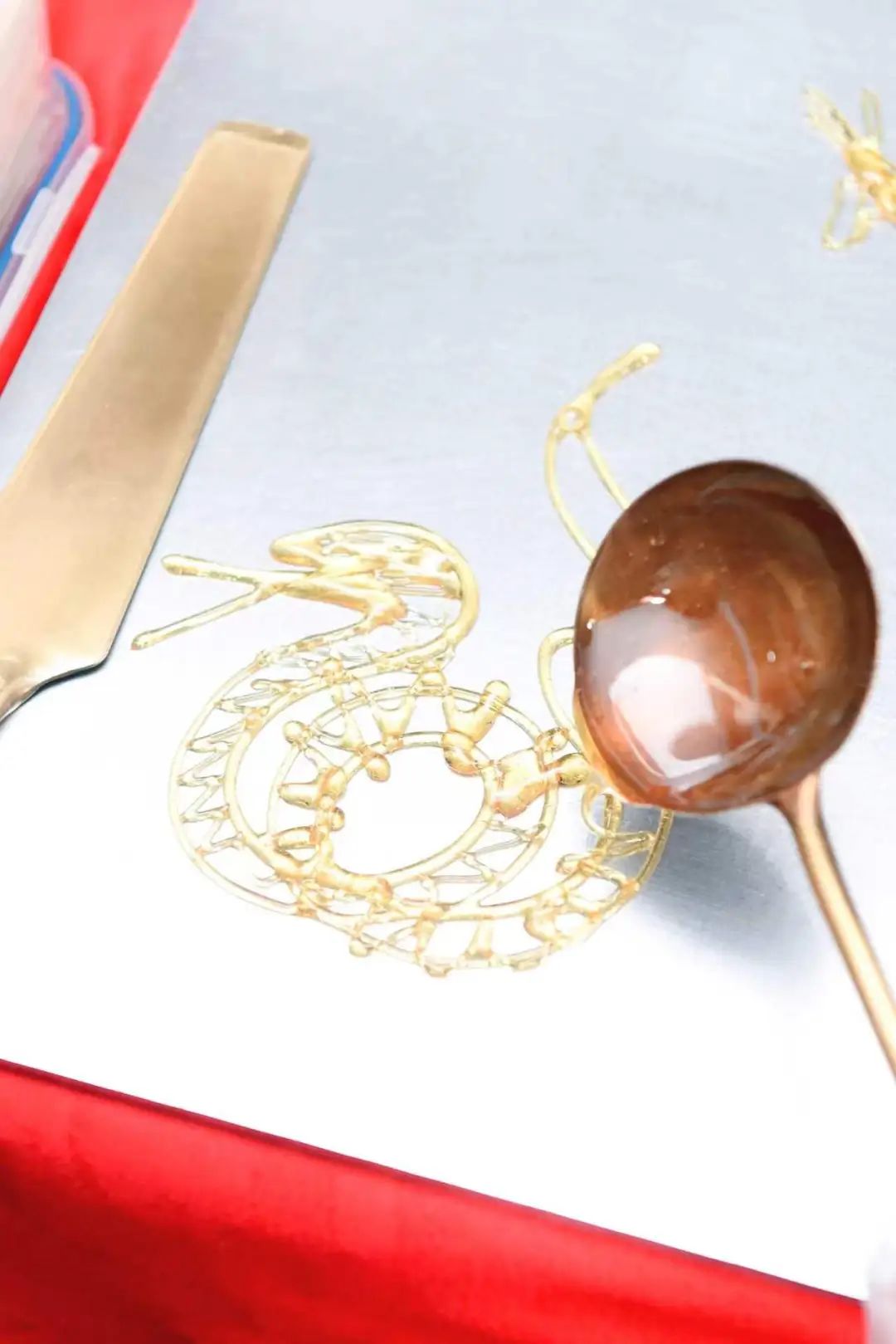 “糖画”区熬制好的糖浆在锅中冒着热气,散发出诱人的香甜气息。糖画师傅拿起勺子,舀起一勺金黄透亮的糖浆,在光洁的石板上挥洒自如。只见他手腕翻转,线条流畅,眨眼间,一条栩栩如生的灵蛇便跃然石板之上,引得老师们阵阵惊叹。