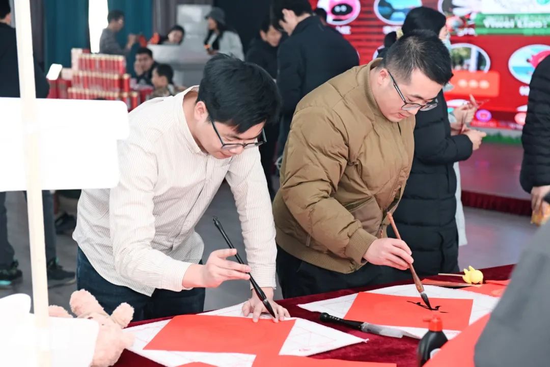 “写对联”区域,墨香四溢,老师们挥毫泼墨,写下一副副对仗工整、寓意吉祥的对联,为新年增添了浓浓的文化气息。