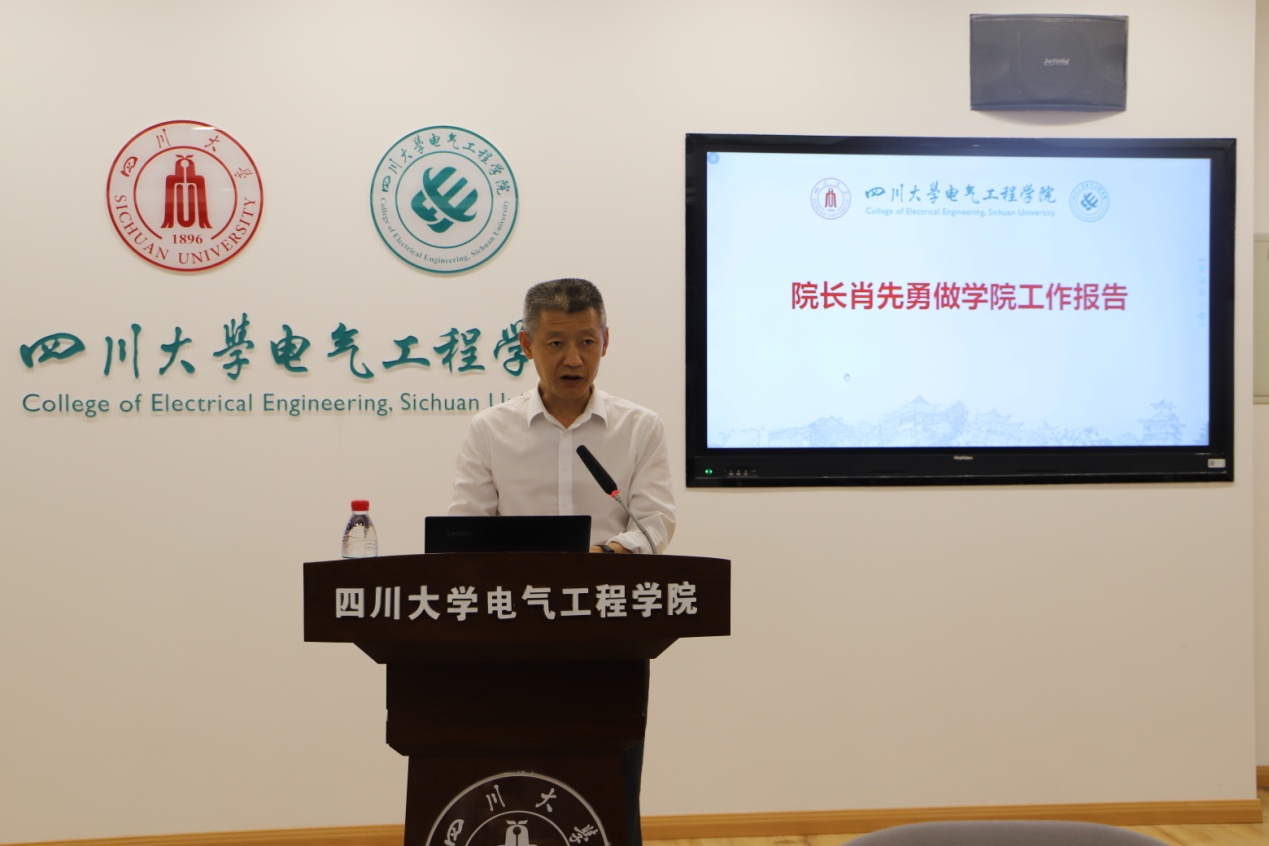 学院院长肖先勇作年度院长工作报告。在报告中,肖院长总结了2020年全院工作,并提出下一阶段工作重点。他讲到,过去一年半,在校党政、院党委正确领导下,学院坚持“以人为本”,党政团结,师生齐心,党建事业融合发展,各方面成绩显著。下一阶段,学院将围绕双碳目标、清洁低碳安全高效的能源体系、以新能源为主体的新型电力系统,在师资队伍建设、科学研究发展、人才培养质量、治院办学能力等方面砥砺前行、争创一流。