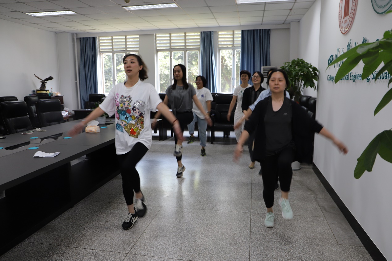 活动过程中,学院采用腾讯视频会议和雨课堂相结合的方式,精心设立了直播主会场,各单位设立5个运动分会场同步跟播。主播首先在主会场热情满满地向大家介绍了此次活动的规则,为大家展示了准备的丰厚奖品。随后,当主播间运动健身视频音乐响起,各分会场女教师们便跟着律动的音乐运动起来,拉伸、跑跳……一连串有氧运动之后,老师们充分体会了运动带来的畅快之感。三段健身操间隙中,直播间还为老师们组织了抽奖环节,中奖的老师们都无比开心。