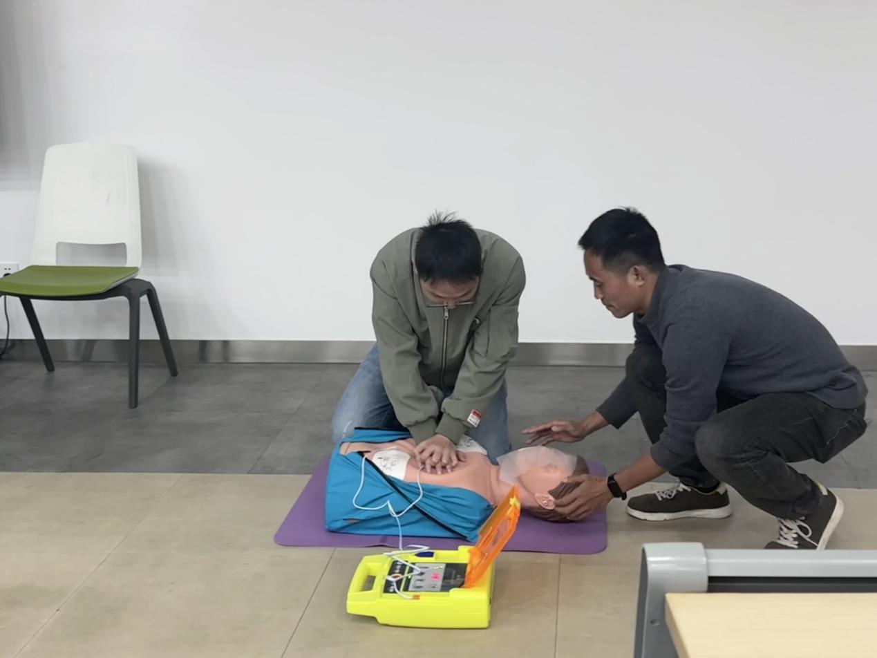 接着,罗老师讲述了在紧急情况下正确进行救助的重要性,并重点介绍了一种关键技能——“黄金四分钟”心肺复苏(CPR)。同学们通过观看视频和借助人体模型和AED模型机进行现场模拟演练的形式系统学习了心肺复苏的完整流程及注意事项。