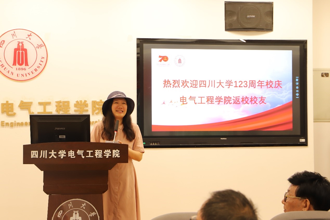 学院党委书记韩芳在会上讲话。她首先代表学院领导班子和全体师生向回家的校友们表示热烈欢迎和感谢,随后她从学院的发展历史、师资情况、学科建设、青年教师培养、科研和团队、本科人才培养等几个方面向校友们介绍了近几年学院发展情况。最后她再次感谢校友们对学院发展的关心和支持。
