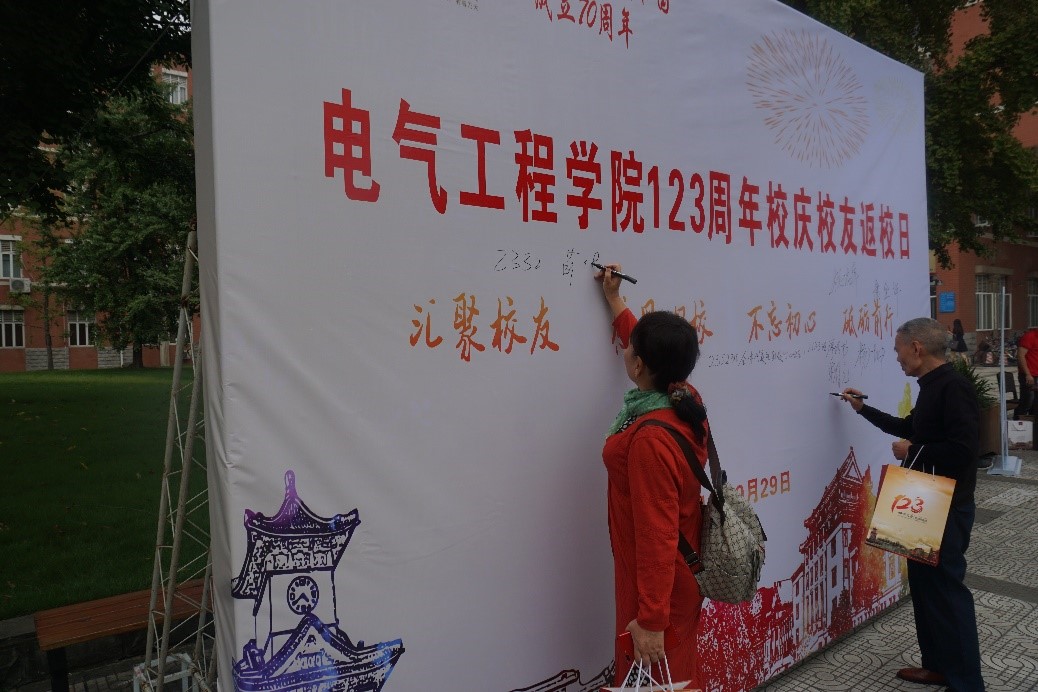 上午八时,学院欢迎台前到处洋溢着喜庆的气氛,校友们神采奕奕,陆续前来签到,学院为校友们精心准备了学校123周年校庆纪念章,大家在背景墙前拍照留念。