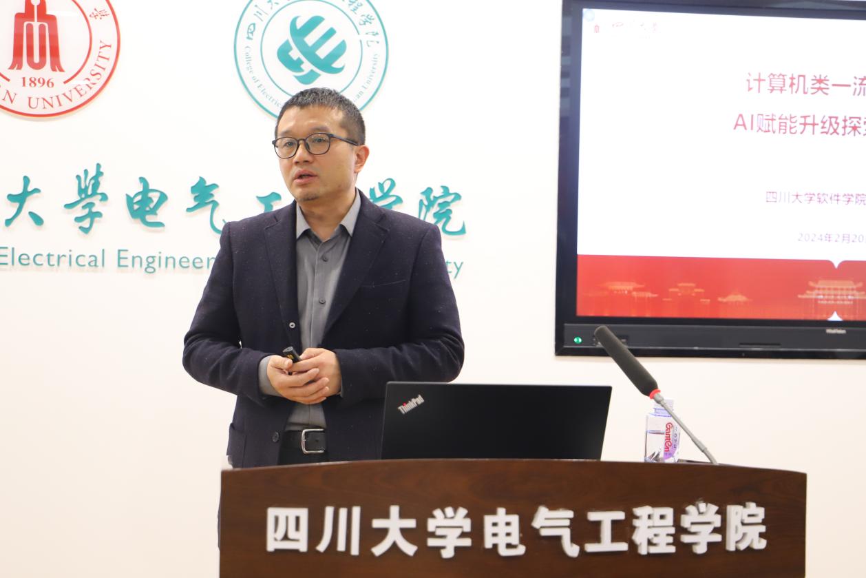 为进一步学习贯彻全国教育大会精神,落实学校关于在全校开展一流本科教育教学发展大讨论的工作要求,开展数智时代AI赋能一流本科发展研讨,本次工作会安排了专题报告,用于指导老师们提升关于AI技术与课程教学相结合的认识。计算机学院(软件学院、智能科学与技术学院)副院长严斌宇受邀作了题为“计算机类一流课程的AI赋能升级探索与实践”的报告。他围绕人工智能赋能高等教育教学背景、先行者的探索进行了详细讲解,并重点分享了其在一流课程建设与AI赋能升级的实践经验和对未来AI技术进一步应用于一流课程建设的相关思考。