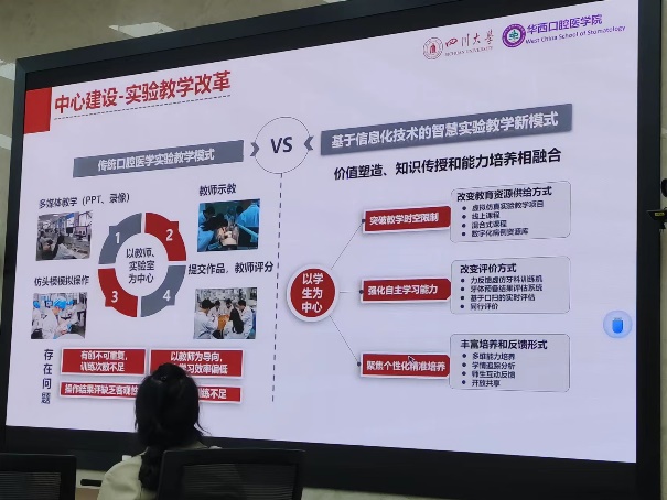 交流会后,我院专业实验中心教师们参观了华西口腔医学院临床技能中心和华西口腔医学国家级实验教学示范中心、国家级虚拟仿真实验教学中心,现场体验了信息化、沉浸式、交互式的临床实践技能教学模式和产学研协同创新的口腔数字化虚拟仿真培训系统,并学习实验教学示范中心建设材料。本次国家级实验教学示范中心经验交流会学习,为我院专业实验中心在实验教学育人以及创新人才培养等方面的发展建设提供了新的思路和方法。