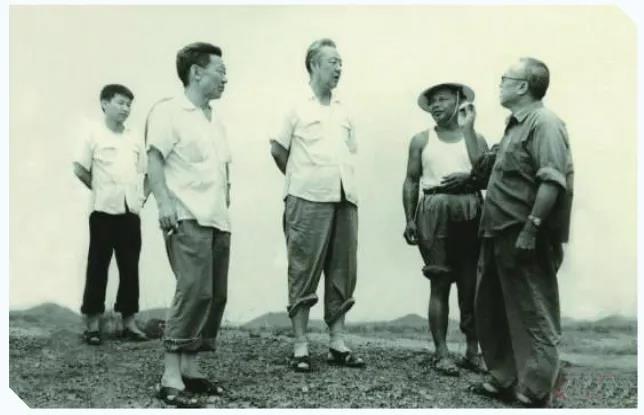 1978年8月,习仲勋(左三)在广东惠阳农村调研。在清华大学学习的习近平(左一)利用暑假时间参加社会实践,随同父亲一起下乡