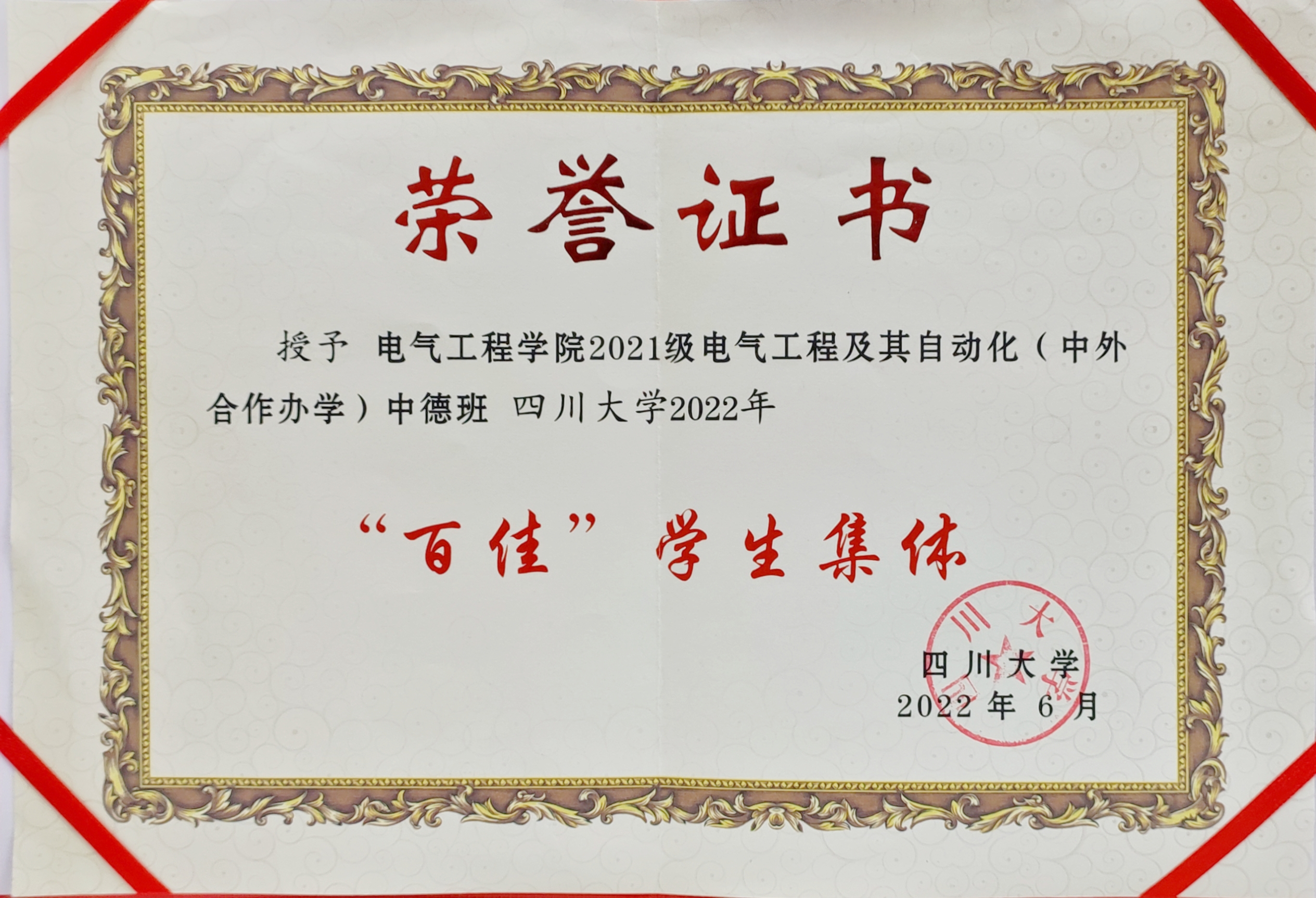 2022年6月,经集体申请,单位审核推荐,学校学工部、研工部、校团委共同组织评审,永利集团3044am2021级中德班获评“四川大学2022年百佳学生集体”荣誉称号。