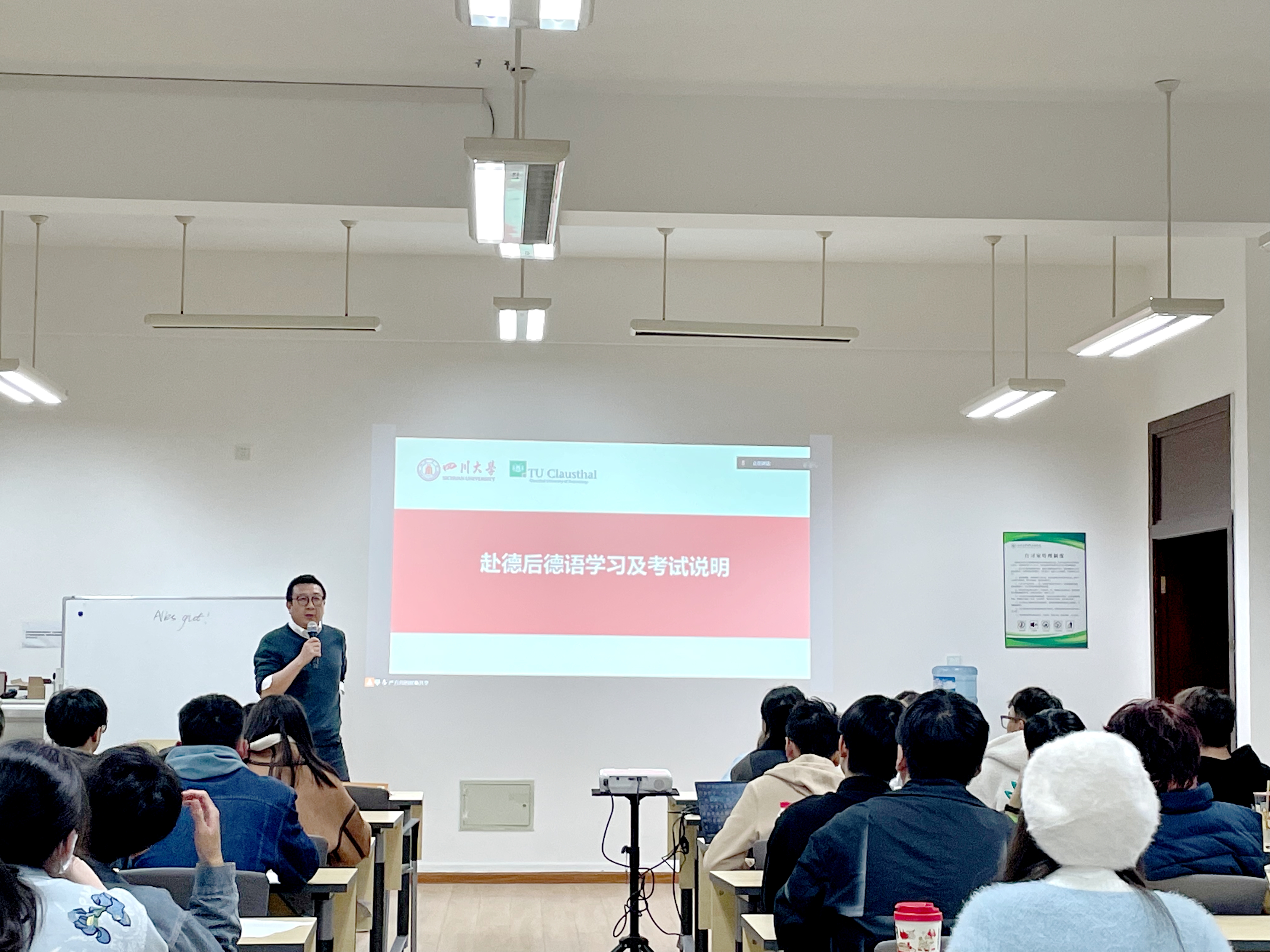 2023年3月7日晚,我院2021级中德班赴德流程说明会在江安校区二基楼B103教室顺利举行。2021级中德班即将于本学期完成前两学年在川大的学习,并于今年秋季学期赴德国克大开始第三学年的学习。永利集团3044am院长助理陈实,中德项目辅导员及行政管理老师于孜清、朱愉田、张灿、严方舟、杨振尧及2021级中德班全体学生参加了本次说明会。说明会由朱愉田主持。