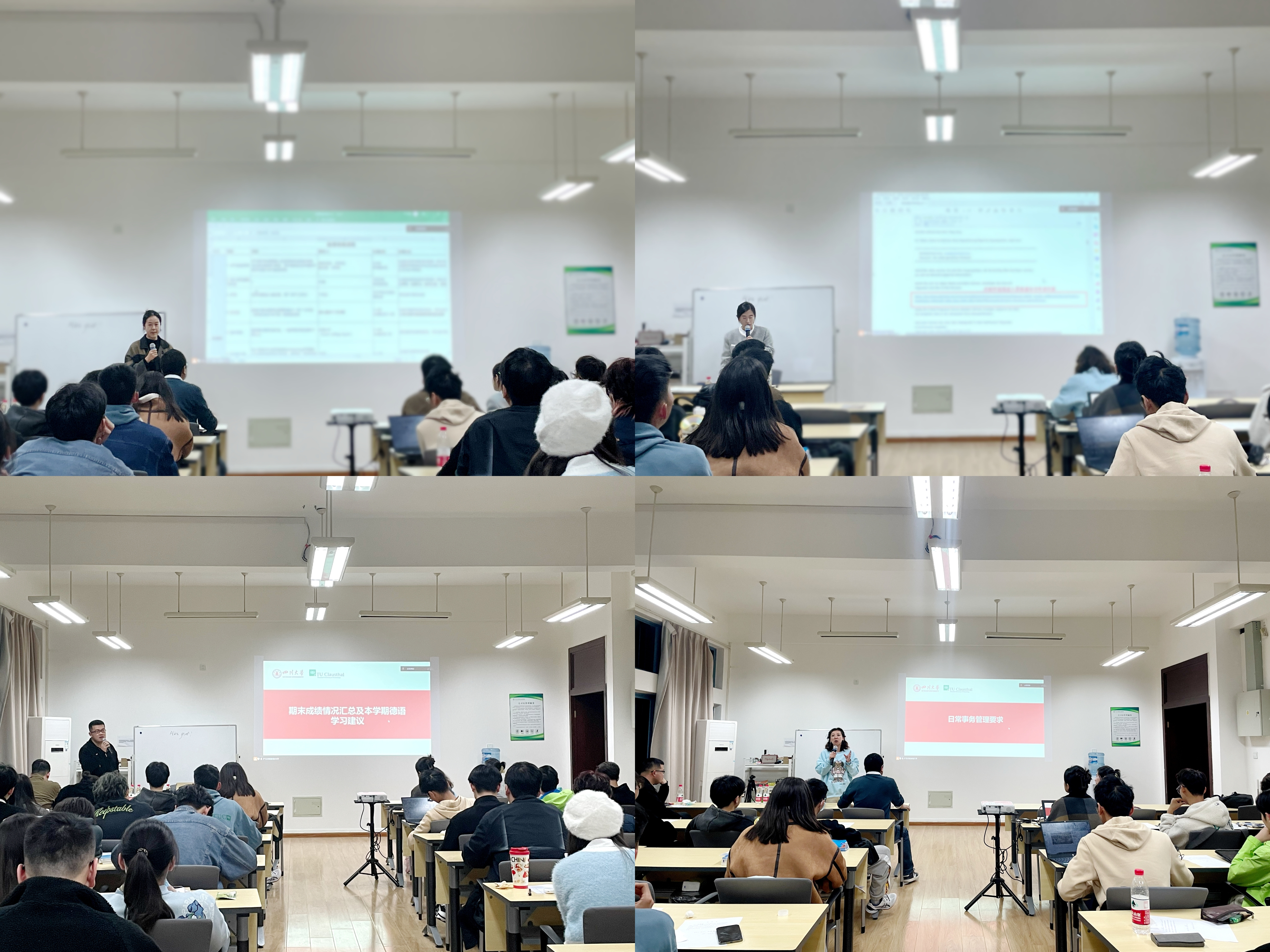 随后,严方舟、张灿、杨振尧、于孜清老师依次发言。严方舟老师就赴德整体流程和费用及目前APS审核材料的收缴情况进行了说明,提醒同学们务必要按时提交材料以保证各项手续的进度。张灿老师介绍了克大录取通知书申请流程,并对申请系统中的常见问题进行了说明。杨振尧老师总结了上学期期末成绩情况,希望同学们继续保持良好的学习态度,并建议在本学期加强德语口语和听力的练习。于孜清老师再次强调了日常事务管理要求,要求同学们注意班级纪律和班风建设。