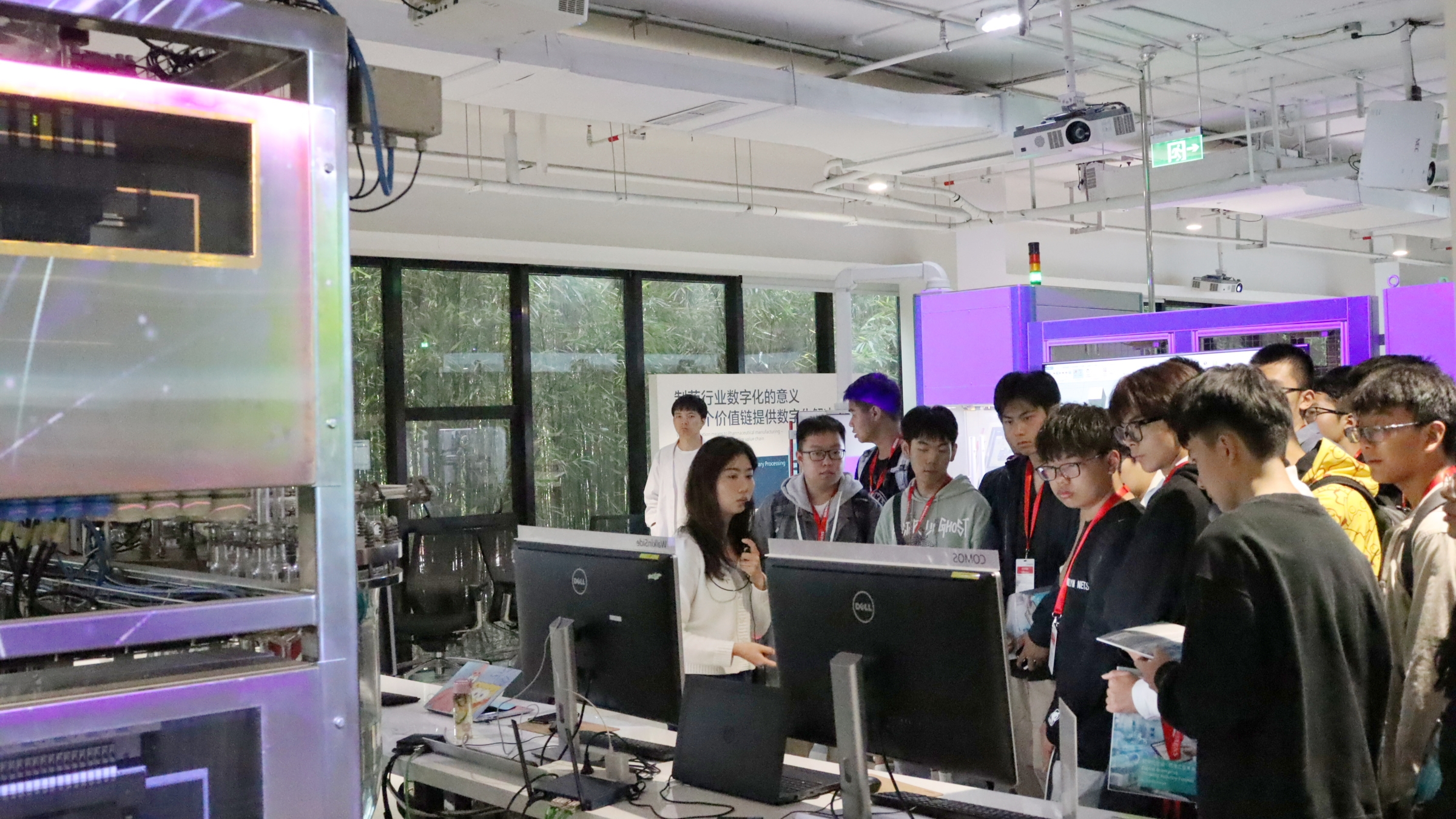在离散行业数字化示范线,讲解员对大规模定制化的未来制造模式进行了说明。通过互动演示装置,同学们沉浸式地体验了数字孪生以虚拟的方式对制造环节进行指导和优化,以满足大规模定制化下的效率和个性化的结合。