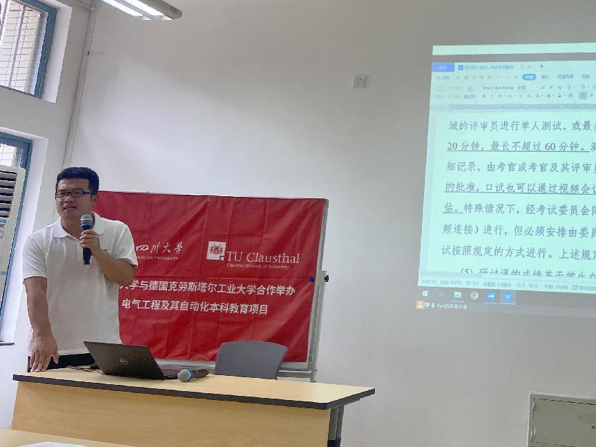 我院电气中德项目首届中德班学生将于今年暑期赴德国克大开始学习。2023年6月2日下午,2021级中德班“赴德学习及升学指导”主题班会在江安校区二基楼B103教室顺利举行。永利集团3044am院长助理陈实,中德项目行政管理、辅导员老师及2021级中德班全体学生参加了本次班会。班会由中德项目辅导员朱愉田老师主持。